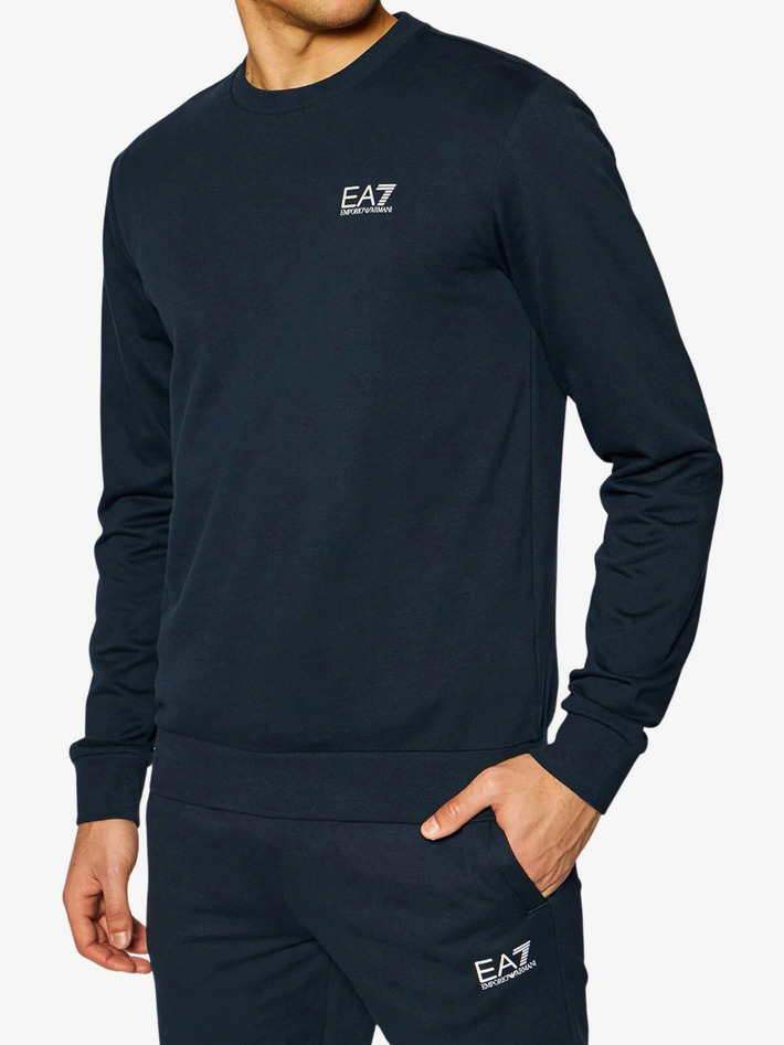 Postaw na styl i komfort z męską bluzą EA7 Emporio Armani w kolorze granatowym. Wykonana z wysokiej jakości, 100% bawełny, (ściągacz: 97% bawełna, 3% elastan) zapewnia naturalną przewiewność i wygodę noszenia na co dzień. Bluza ma klasyczny fason Regular Fit, dzięki czemu doskonale układa się na sylwetce, nie krępując ruchów.